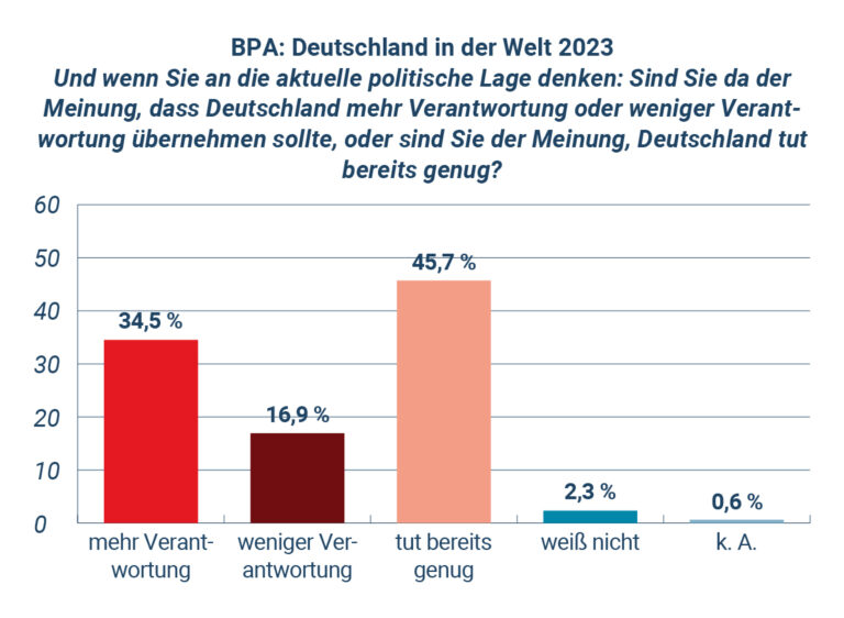Grafik: Drei Fragen zur internationalen Verantwortung Deutschlands aus dem Jahr 2023 mit jeweils unterschiedlichen Formulierungen und Antwortoptionen. Details zu Erhebungszeitraum, Erhebungsmethode, Stichprobengröße und weitere Informationen finden sich in den Fußnoten im Online-Anhang.